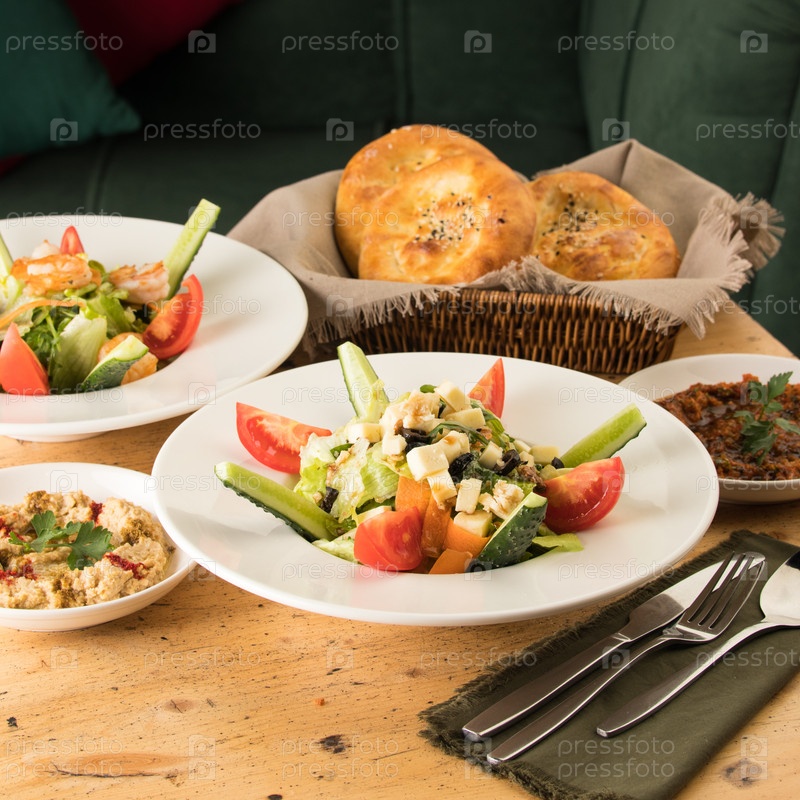 Обеденный стол, полный вкусного салата на белой тарелке рядом с корзиной хлеба