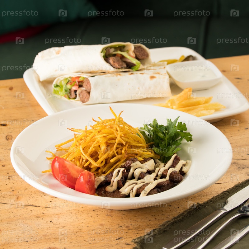 Крупный план вкусного блюда с измельченным картофелем, говядиной, соусом и бутербродами