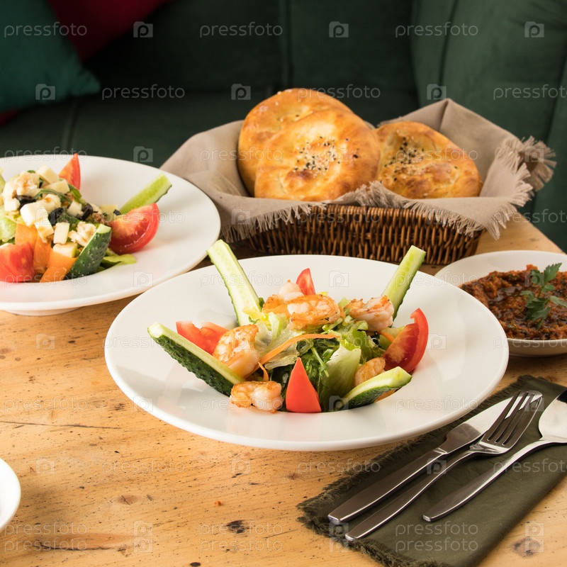 Обеденный стол, полный вкусного салата на белой тарелке рядом с корзиной хлеба