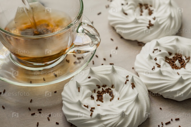 Черный чай в прозрачной чашке с воздушными домашними безе крупным планом