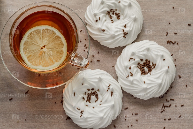 Черный чай с ломтиком лимона в прозрачной чашке и воздушные домашние безе крупным планом