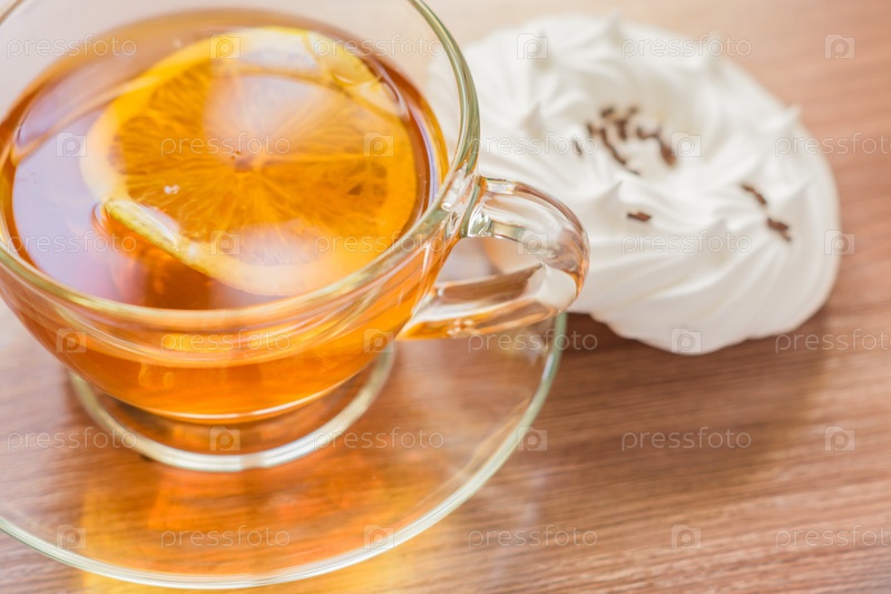 Черный чай в прозрачной чашке с воздушными домашними безе крупным планом