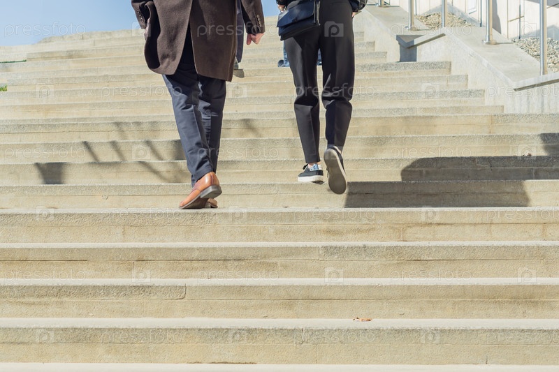 Два человека в деловой повседневной одежде идут по лестнице на улицу. Городской фон