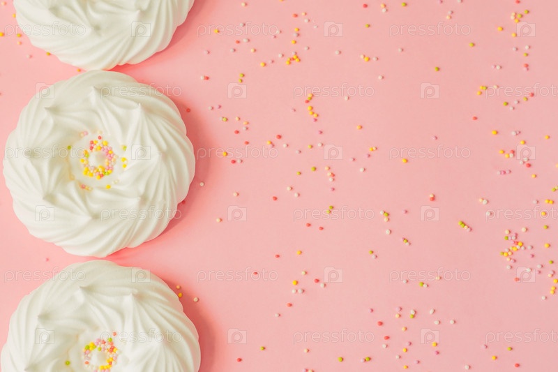 Вид сверху на домашние белые воздушные безе и кондитерские украшения на розовом фоне