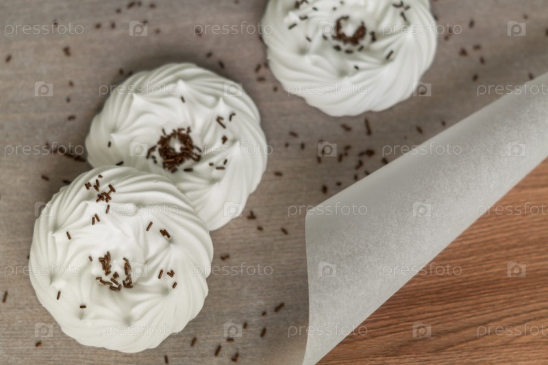 Вид сверху на домашние белые воздушные безе и кондитерские украшения на пергаментной бумаге