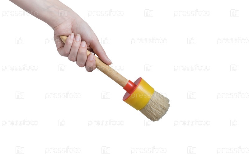 Женщина держит в руке большую кисть для ремонта. изолированный