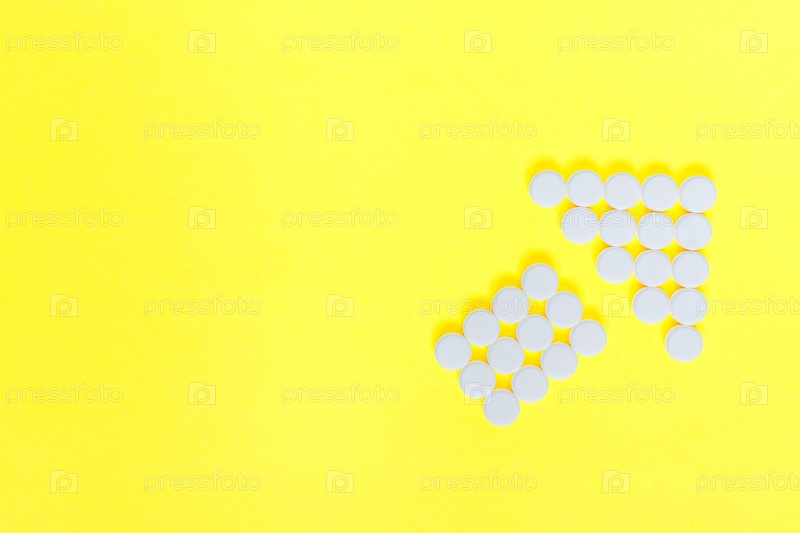Белые таблетки в форме стрелки на желтом фоне. Концепция медицины и здравоохранения