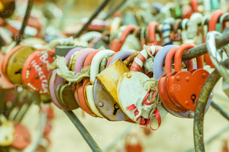 Множество разноцветных любовных замков на металлических перилах моста. выборочный фокус, тонированное