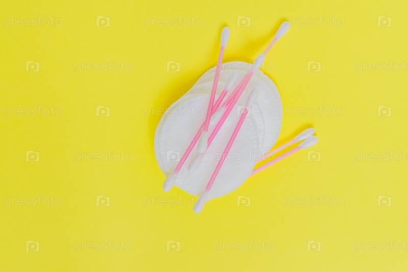 Косметические ватные диски и ватовые палочки на белом фоне.Сделайте концепцию yp и уход за кожей