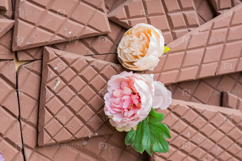 Два искусственных цветущих пиона на фоне разбитой плитки