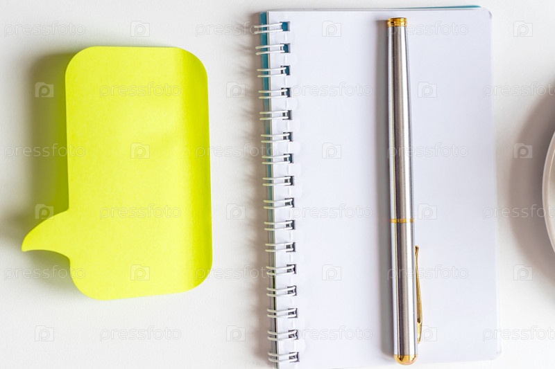 Вид сверху на пустой спиральный блокнот, серебряную ручку, желтую наклейку и чашку кофе на белом фоне. Концепция бизнеса или образования