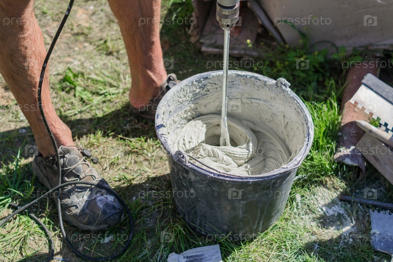 Смешивание клея для плитки или цемента с дрелью для ремонтных работ на строительной площадке