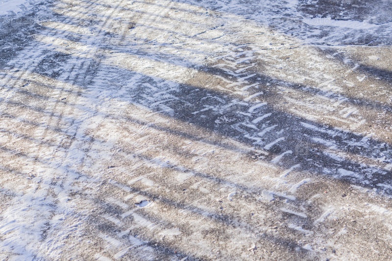 Следы колес на зимней дороге, покрытой снегом в солнечный день