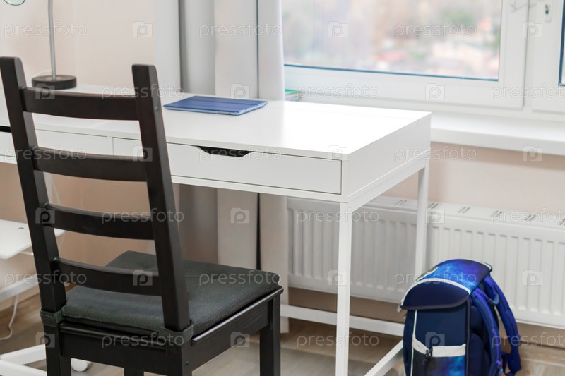 Рабочее место студента дома. Белый стол и черный стул у окна