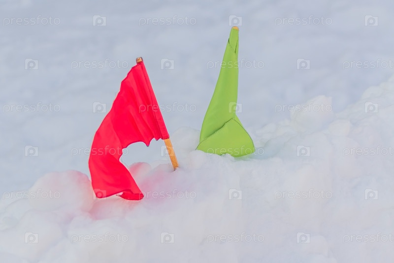 Зеленые и красные флаги в снегу. Контрольно-пропускной пункт соревнований по зимним видам спорта