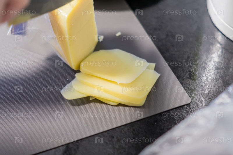 Ломтики сыра на разделочной доске, приготовление бутербродов на завтрак