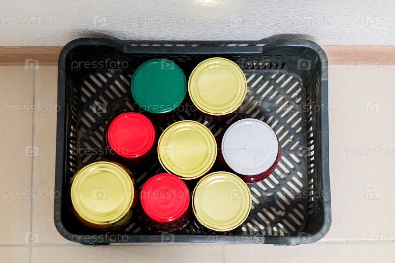 Вид сверху на зимние консервы - банки с маринованными овощами и фруктами в пластиковой коробке на полу