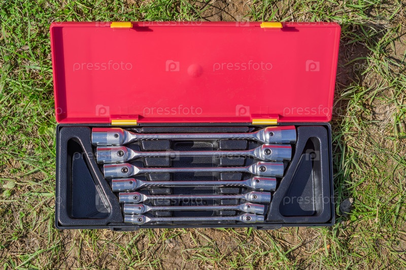 Набор торцевых ключей в красном и черном футляре на земле, вид сверху на рабочие инструменты
