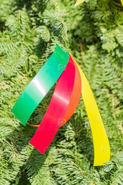 Крупный план рождественской футболки, украшенной разноцветными атласными лентами красно-желтого и зеленого цветов, новогодний фон