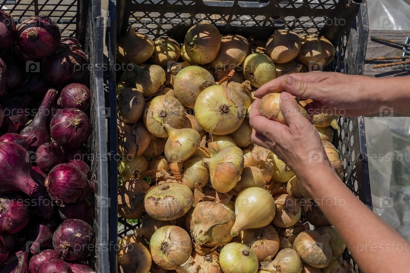 Новый урожай лука в пластиковых ящиках. Женская рука чистит спелый красный лук