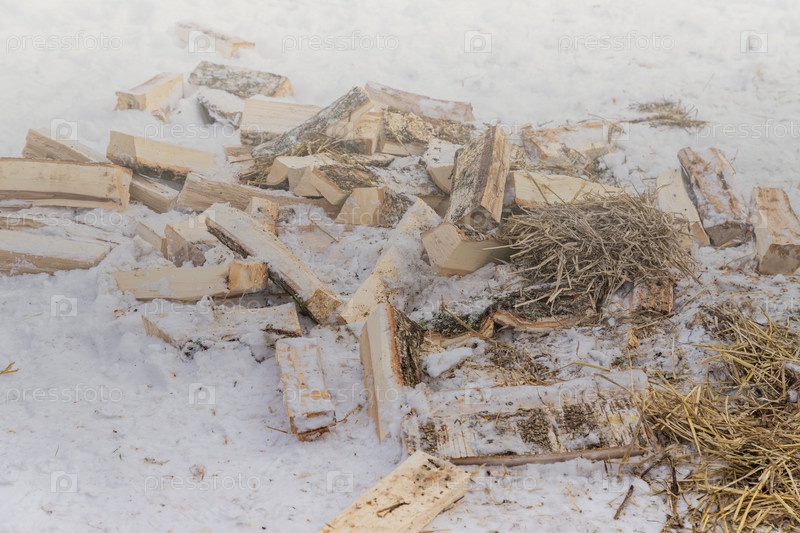Куча деревянных дров на снегу, приготовленная для того, чтобы согреться зимой