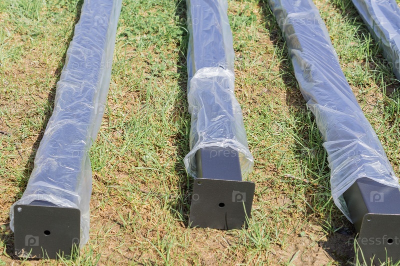 Новые металлические сваи в пластиковой упаковке на строительной площадке. Стальные материалы. Строительные материалы