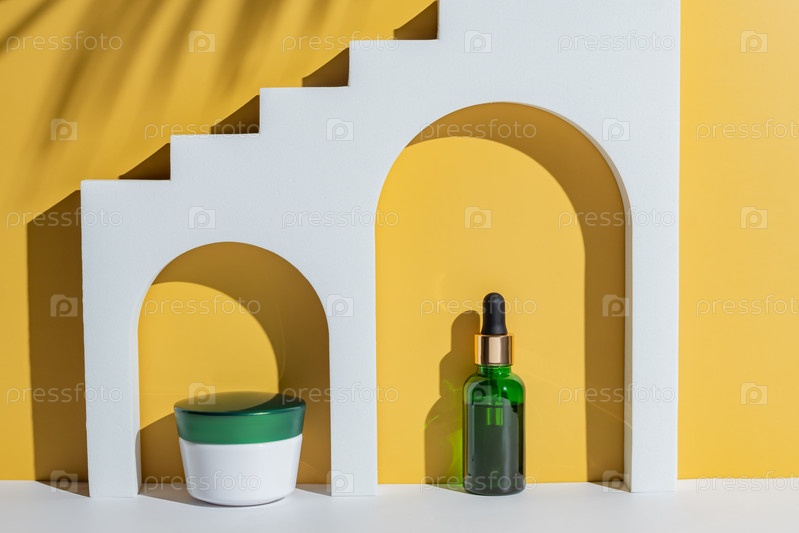 Зеленая стеклянная бутылка с пипеткой и банкой с кремом в белых декоративных арках на желтом фоне. Шаблон для косметических жидких продуктов, рекламы и продвижения