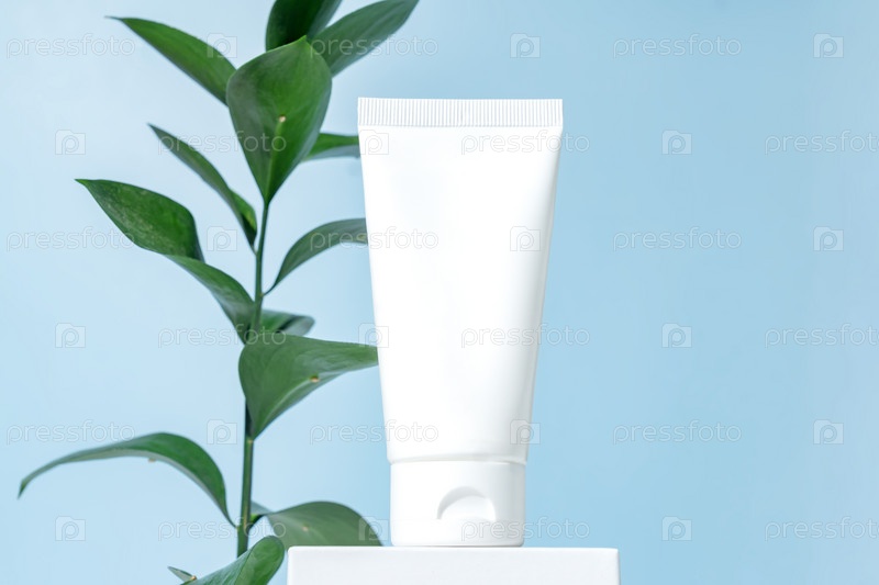 Белая пустая косметическая кремовая трубка для макета на белом подиуме на синем фоне. Упаковка косметики
