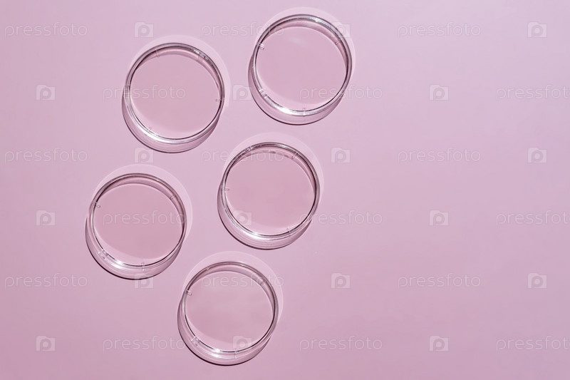 Стеклянные чашки Петри на розовом фоне. стерильная лабораторная посуда, готовая к анализам. анализа и химического эксперимента. оборудование для выращивания клеточных культур или тестирование косметики. вид сверху. концепция медицинской лаборатории