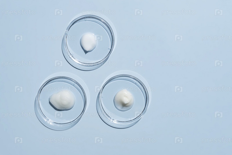 Стеклянные чашки Петри с мазком крема для лица на синем фоне. тестирование косметических продуктов. Дерматологическая научная косметическая лаборатория