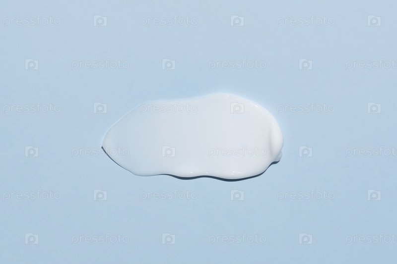 Белый косметический крем для лица или лосьон для тела увлажняющий штрих на пастельно-голубом фоне. Гигиеническое средство по уходу за кожей с кремовой текстурой. Образец мазка крема для лица на цветном фоне