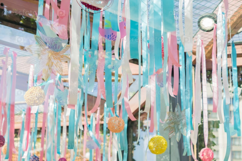 Красочное уличное украшение - синие, белые и розовые шелковые ленты, свисающие с потолка