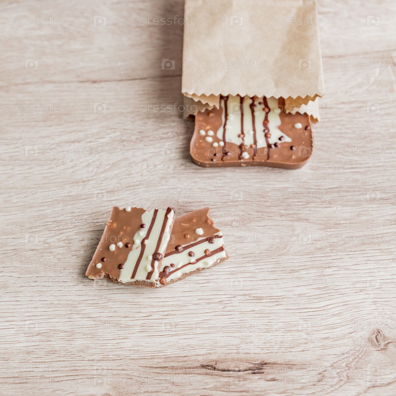 Плитка молочного шоколада с чипсами на деревянном фоне в крафт-бумаге