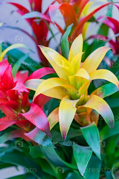 Красочные цветущие цветы бромелии в помещении, мягкий фокус