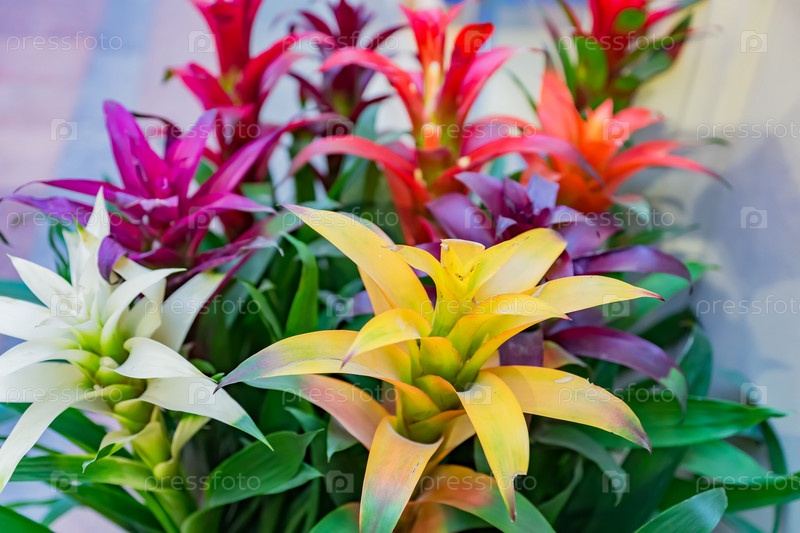 Красочные цветущие цветы бромелии в помещении, мягкий фокус