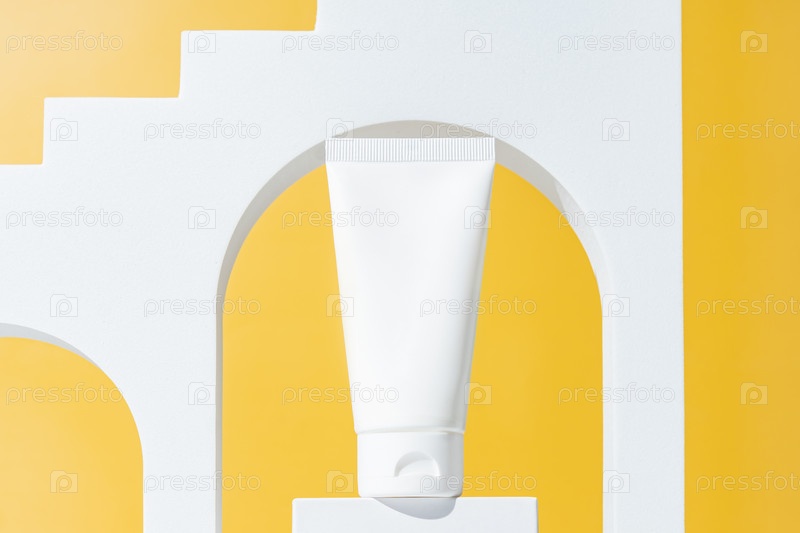 Пустая белая пластиковая косметическая трубка и белый арочный подиум на ярко-желтом фоне. Уход за кожей, косметические процедуры, спа-концепция. Модная витрина косметической продукции