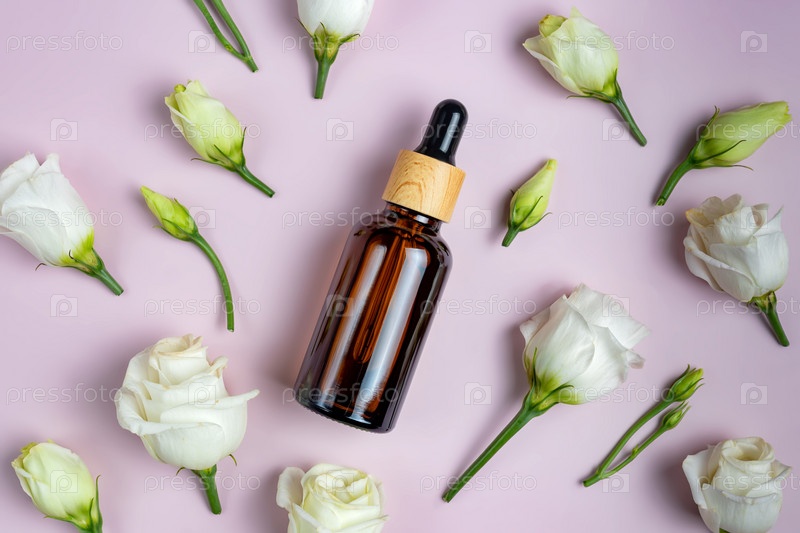Косметическая бутылка из темного стекла с капельницей, нежные весенние цветы на розовом фоне. плоский вид сверху. Весенняя концепция натуральной органической косметики, косметическое растительное спа-масло. Макет