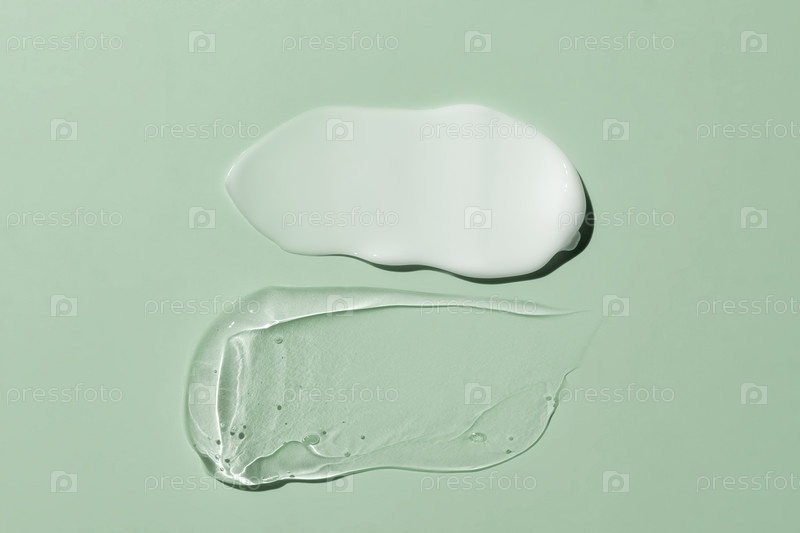 Косметические мазки кремовой текстуры на зеленом фоне. Капля сыворотки красоты. Образец прозрачного кремового средства по уходу за кожей