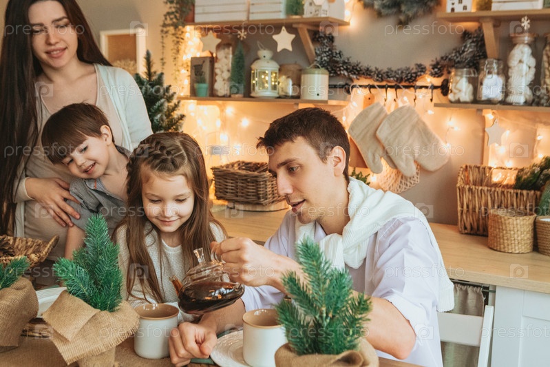 Молодая счастливая европейская семья с детьми вместе наслаждается рождественскими праздниками в уютной домашней атмосфере