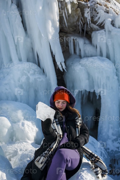 Девушка с красивой сияющей улыбкой в солнечную зимнюю погоду и красной шляпой держит сосульку с озера Байкал