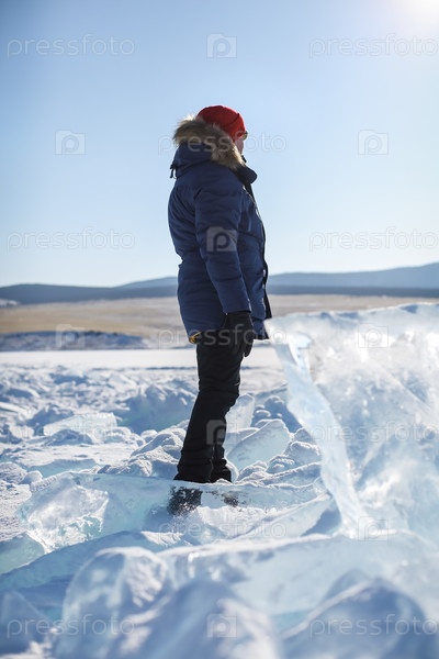 Портрет мужчины-туриста в красной кепке и синей куртке в солнцезащитных очках на льду