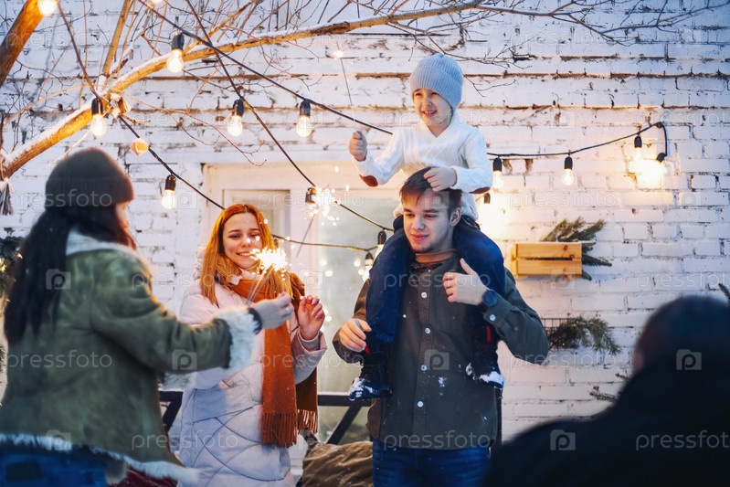 Портрет большой счастливой семьи с ребенком, стоящим во дворе заснеженного дома и держащим в руках зажженные бенгальские огни. Родители и дети разного возраста радуются рождественским и новогодним праздникам на свежем воздухе