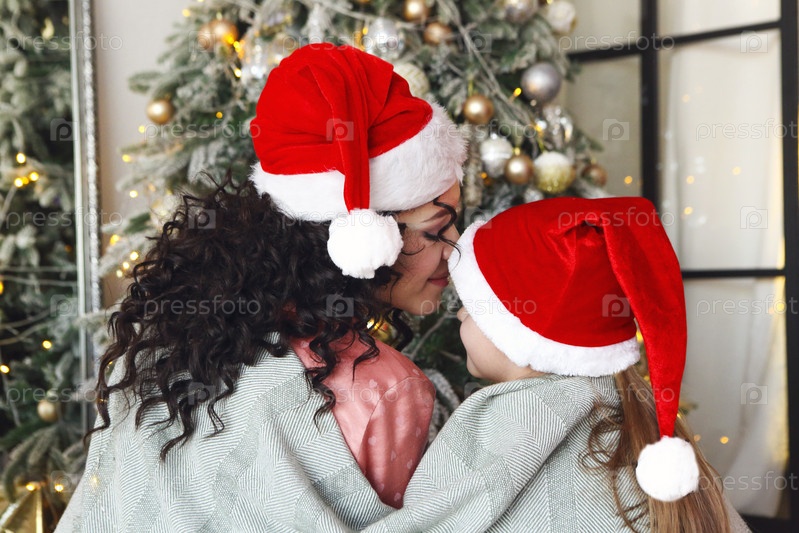 Мать и ребенок в шапках Санты обнимаются под вязаным одеялом на полу возле рождественской елки