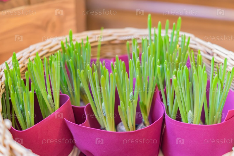 Продаются молодые побеги гиацинтов в плетеной корзине