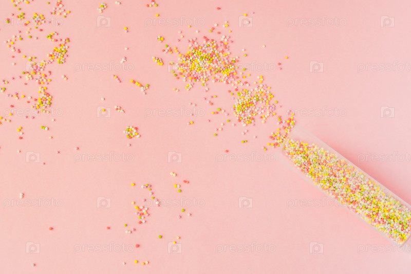 Разноцветные сахарные брызги на розовом фоне. Кондитерские украшения, выливающиеся из пластиковой бутылки