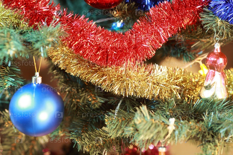 Игрушки на зеленой рождественской ели