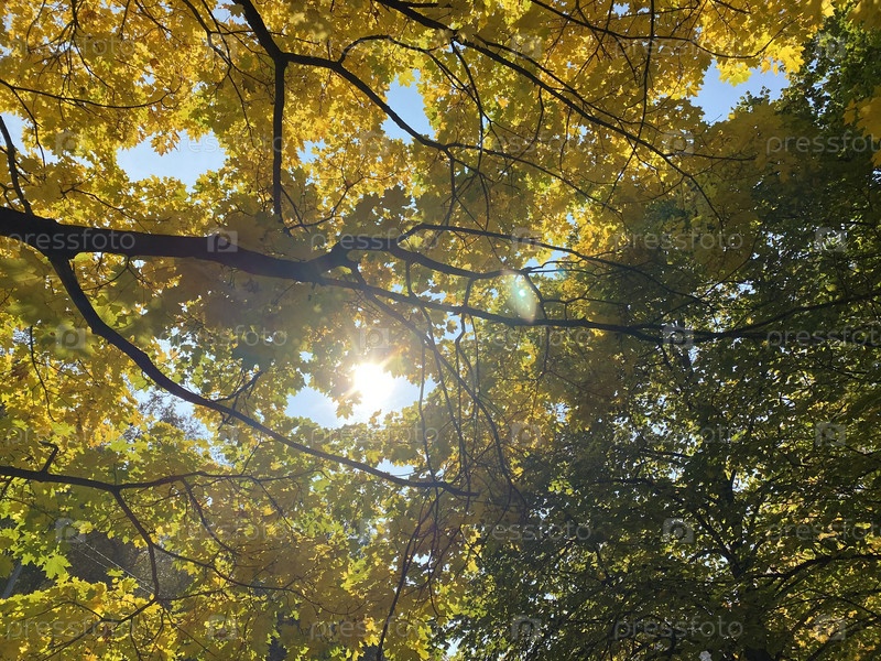 Желтые кленовые листья на дереве в сухой солнечный осенний день