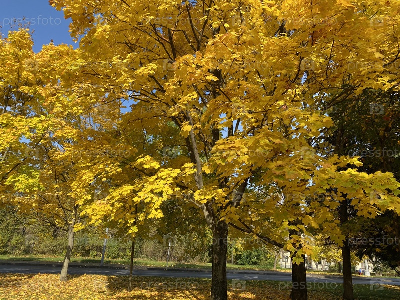Желтые кленовые листья на дереве в сухой солнечный осенний день