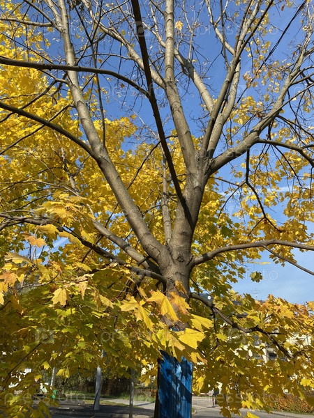 Желтые кленовые листья на дереве в сухой солнечный осенний день