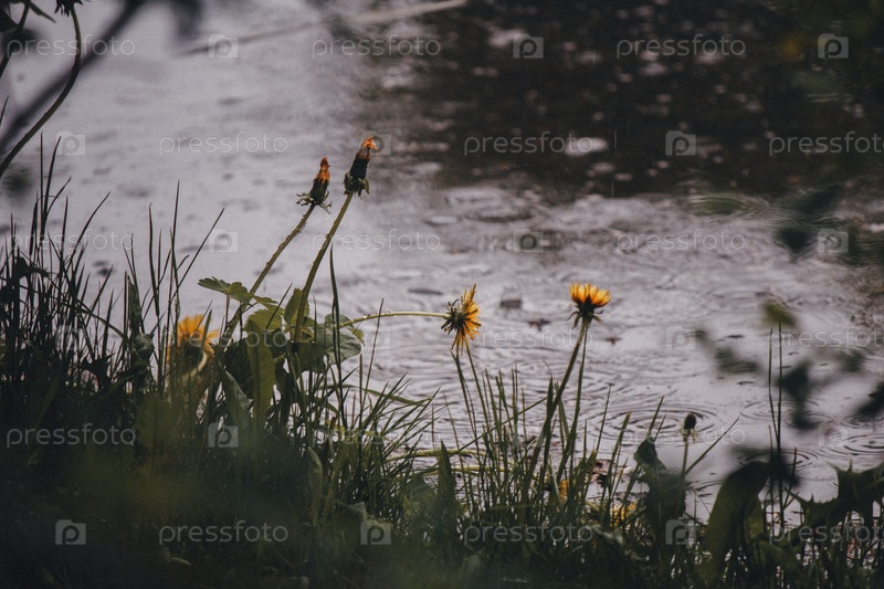 Осенний дождь на фоне цветов одуванчика